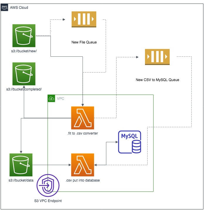 The basic design is depicted in the diagram below, but consists of an S3 bucket to hold the files (low cost), Lambda functions (also really low cost) to process them, and initially I'll use a MySQL RDS for the analytics data store to store the data and generate some aggregate and summary tables (t2.micro instance is in the Free tier). To control the Lambda functions, I've got 2x SQS queues that trigger when a new file is uploaded and when that file is ready to go into my analytics data store.